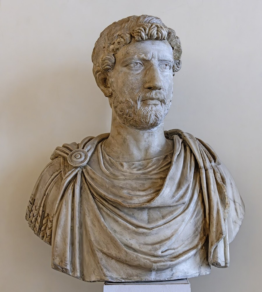 Né en 76 et décédé le 10 juillet 138 à Baïes, Hadrien, empereur romain de la dynastie des Antonins, a marqué l’histoire de Rome par son règne éclairé et sa vision singulière de l’Empire. Successeur de Trajan en 117, il choisit de rompre avec la politique expansionniste de son prédécesseur pour se concentrer sur la paix intérieure et l’organisation administrative. Son souci de sécuriser les frontières de l’Empire le conduit à ériger le célèbre mur d'Hadrien en 122, délimitant ainsi le nord de la Bretagne romaine.